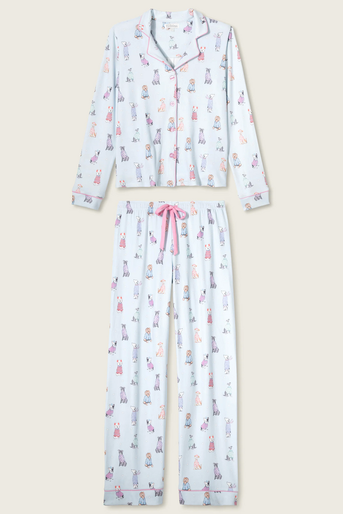 Paw-sitively cozy and snow much fun, this pajama set is crafted from double-brushed pointelle with a light blue backdrop dotted in playful pups dressed for winter. The button-front top and relaxed drawstring pants make it as classic as it is comfy—perfect for snow days, couch hangs, and curling up with your four-legged friend.