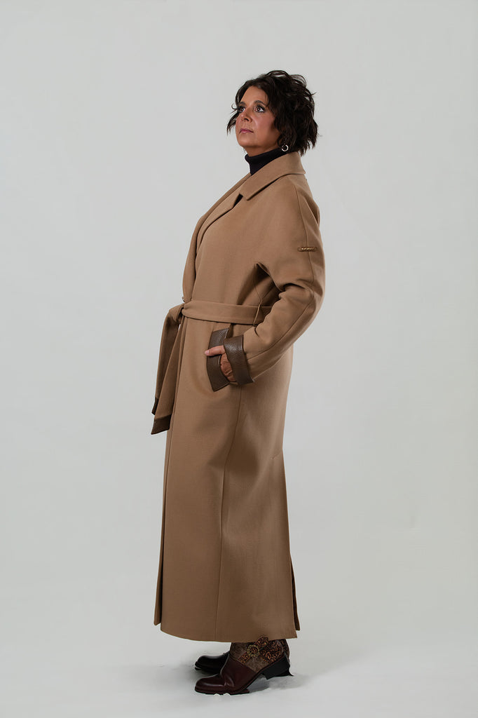 Rafaello Double Breasted Belted Cashmere Blend Coat with Leather Trim - Pastore