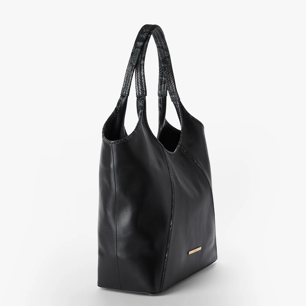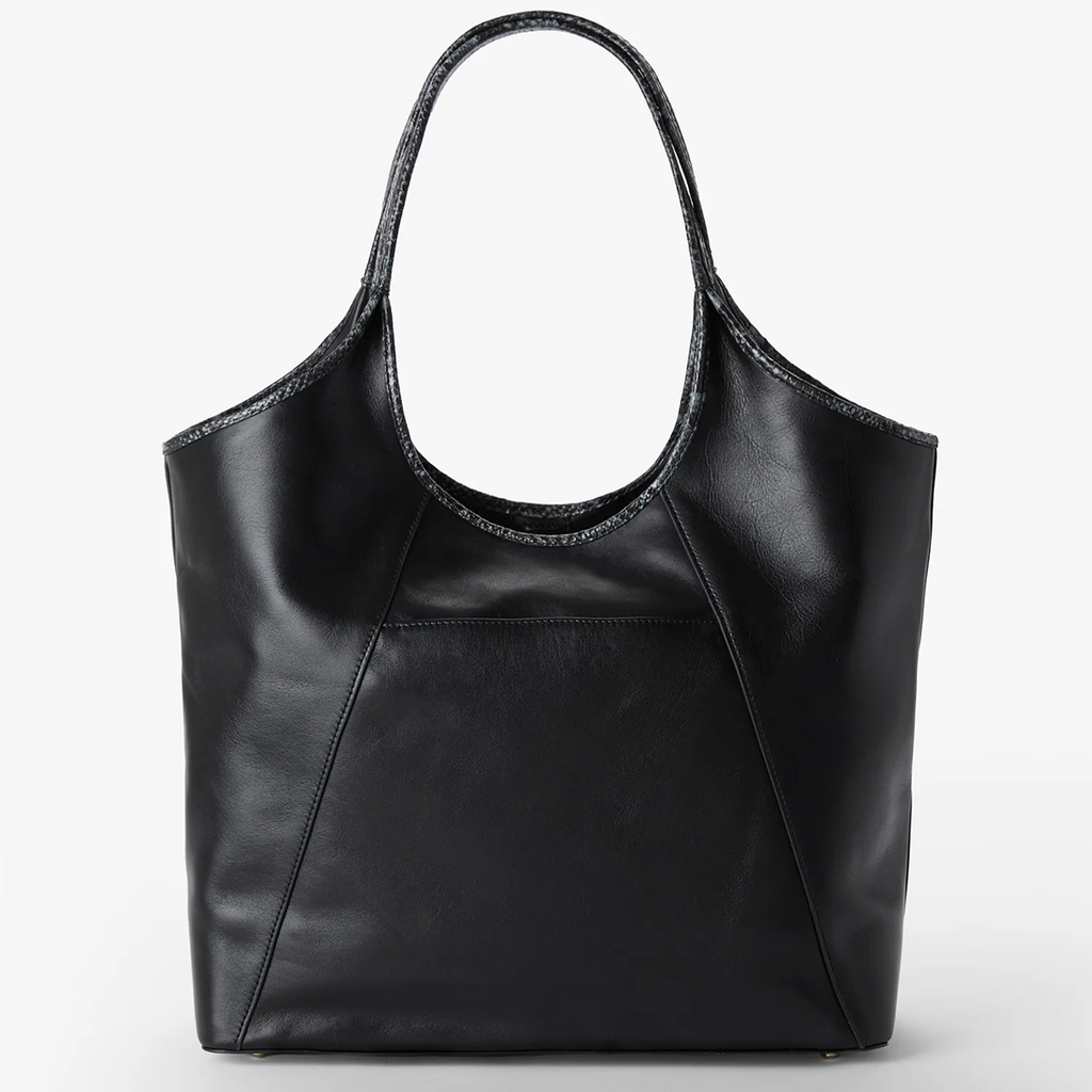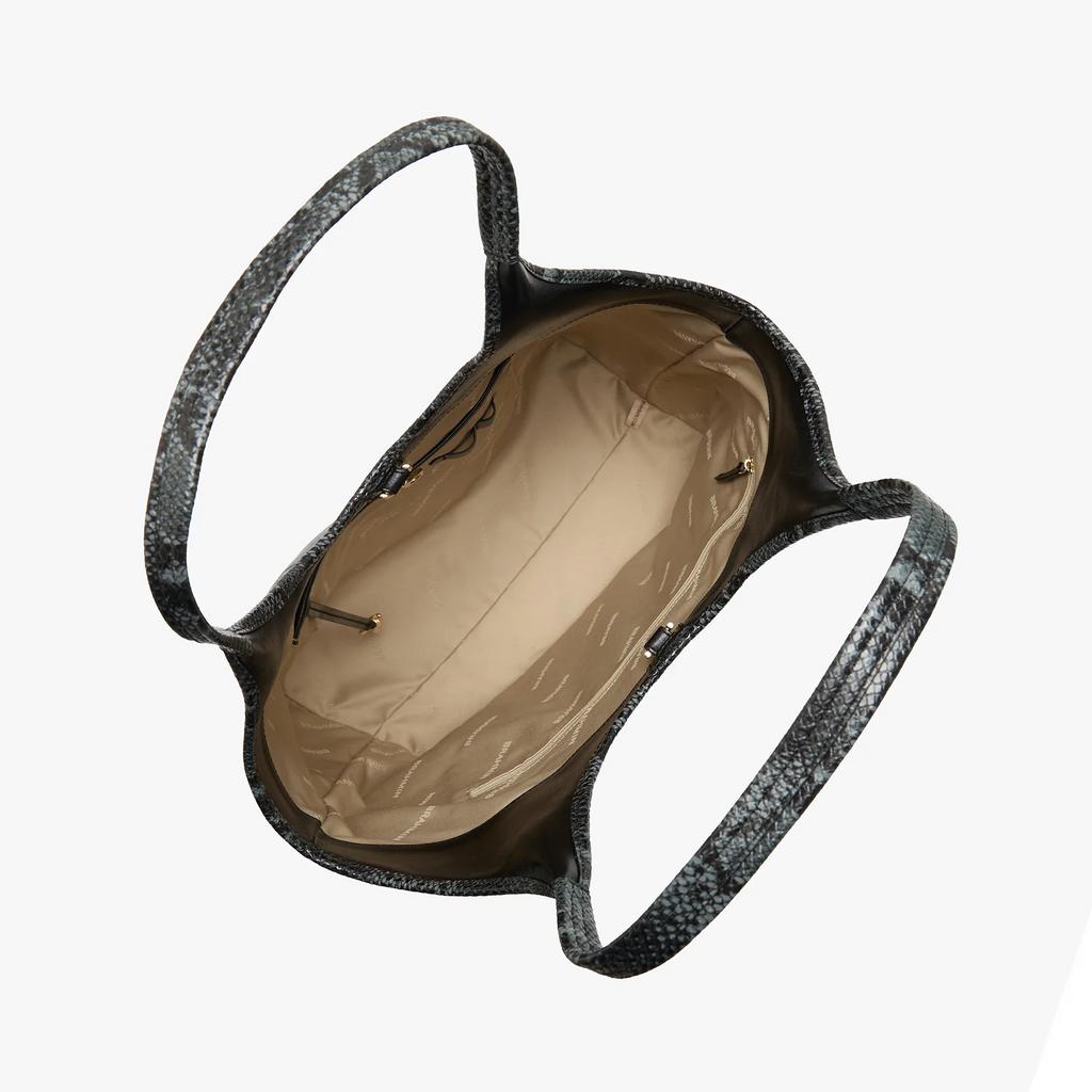 Iona is an ultra-chic oversized tote with a slouchy silhouette featuring smooth leather with a tonal black snake trim. The flat handles are designed for maximum comfort while carrying. An open, key clip closure allows you to easily access your essentials while keeping them secure.
