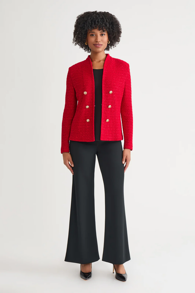 Woven in rich holiday-inspired hues, this jacket brings warmth and elegance to your wardrobe. Soft shoulder pads provide subtle structure for a flattering silhouette, while the double faux breast buttons add a polished, tailored touch.