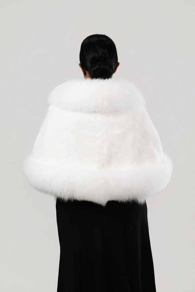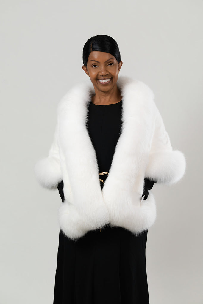 Volare Fox Fur Trim Sectioned Mink Fur Stole with Pockets - White