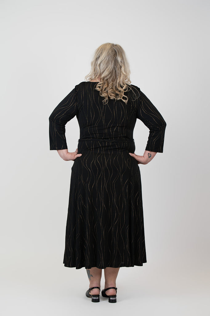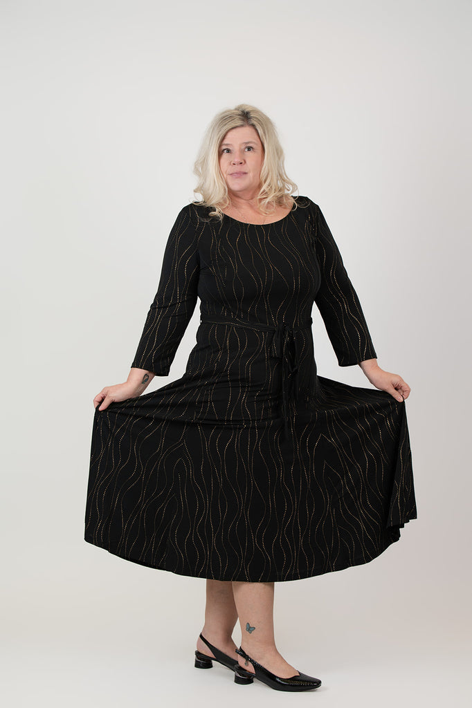 Fashioned in a flowy jersey knit embellished with metallic dots, this effortless dress moves with you wherever the day takes you!