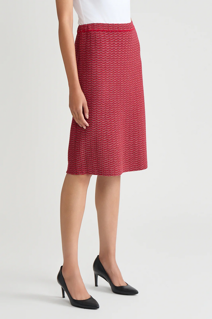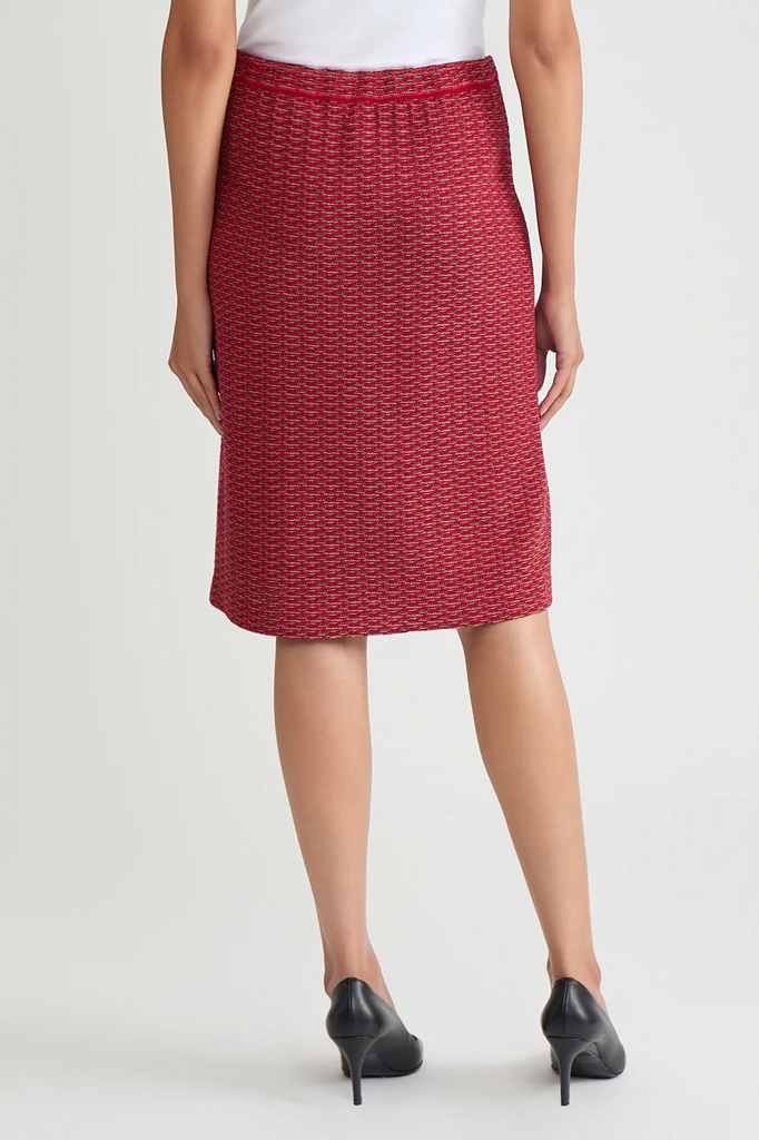 Designed in a festive holiday color palette, this skirt brings subtle sophistication to your seasonal wardrobe. The sleek straight silhouette offers a flattering fit, while the soft knit construction ensures all-day comfort. Perfectly paired with your favorite blouses or the matching jacket, this skirt delivers timeless elegance with a festive twist.