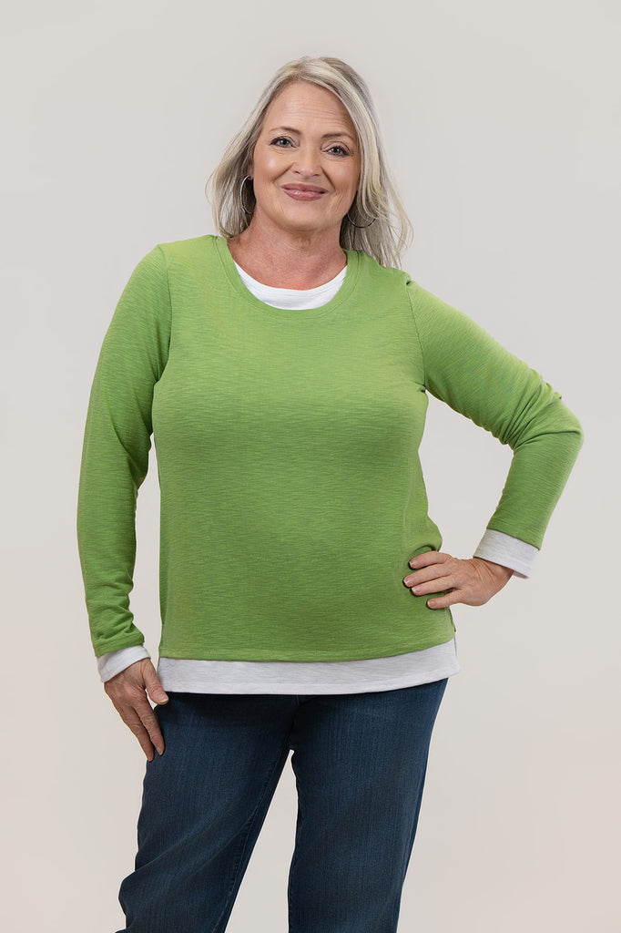 Nally & Millie Contrast Accented Long Sleeve Crew Neck Top - Apple Green